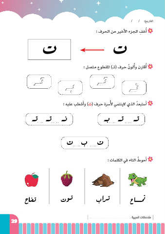 / / :خيراتلا : فرحلا نم يرخلأا ءزجلا ِ فخأ ُ ت ت ُ : لصتم عوطقلما )ـت( فرح ُنولأو نراقأ ُ ـت ـت ـب ـن َ ُ : هيلع بطشأو )ت( فرح ةسرلأ يمتنيلا يذلا ُدعبتسأ َ ـت ـت ـن ـب ـت ـت ت ب ت : تمالكلا في ءاتلا ُطوحأ َ حافت ت وت ب ارت : ةيبرملا تاظحلام 29