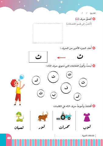 / / :خيراتلا )ث( فرح ُ قصلأ َ َ )تاقصللما مسق لىإ بهذأ( ُ : فرحلا نم يرخلأا ءزجلا ِ فخأ ُ ث ث ُ : ءاثلا فرح يوحت يتلا تاعاقفلا ُنولأو ُ ثحبأ َ ت ث ـث ث ف ث ب ـث َ :تمالكلا في ءاثلا فرح ُطوحأو ُفشتكأ َ نابعث ر وث ث ا رمح ب وث : ةيبرملا تاظحلام 43