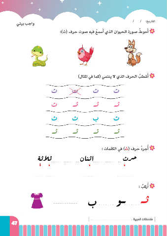 يتيب بجاو / / :خيراتلا َ :)ث( فرح توص هيف ُعمسأ يذلا ناويحلا ةروص ُطوحأ َ )لاثلما في ماك( يمتني لا يذلا فرحلا بطشأ َ ُ ث ت ث ث ث ـث ـث ـث ث ث ب ث ـث ـث ـت ـث : تمالكلا في )ث( فرح ُدرجأ ُ ةثلاث نانثا ث رح : بكرأ ُ ُ ب وـ ـث : ةيبرملا تاظحلام 47