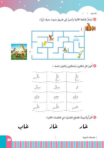 / / :خيراتلا : )غ( فرح توص قيرط في يرسأو ةيتلآا ةهاتلما ُزاتجأ َ ُ : هسفن نوللاب ينلثماتم ينلكش لك نولأ ُ غ ـغ غ ـ ذ ذـ د ث ث ت غ ع ـغ ـ ـ َ ُ َ : ةيتلآا تمالكلا في كترشلما عطقلما ُطوحأَو أرقأ باغ زاغ راغ : ةيبرملا تاظحلام 57