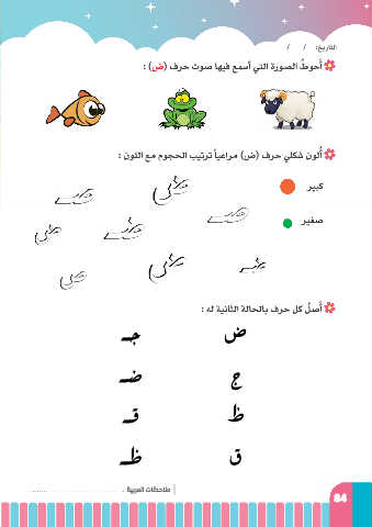 / / :خيراتلا : )ض( فرح توص اهيف عمسأ يتلا ةروصلا ُطوحأ َ : نوللا عم موجحلا بيترت ًايعارم )ض( فرح ليكش نولأ ُ ـص ض ـص يربك ض ـض يرغص ض ـض ص : هل ةيناثلا ةلاحلاب فرح لك ُلصأ َ ـج ض ـض ج ـق ط ـظ ق : ةيبرملا تاظحلام 84