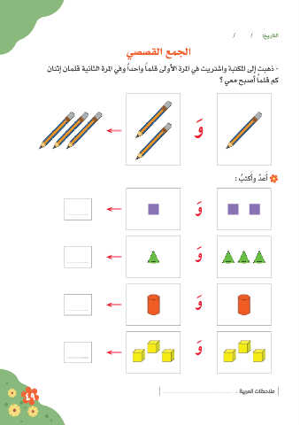 / / :خيراتلا صيصقلا عمجلا نانثإ نمالق ةيناثلا ةرلما فيو ًادحاو ًمالق لىولأا ةرلما في تيترشاو ةبتكلما لىإ تبهذ - ؟ يعم حبصأ ًمالق مك و َ َ : بتكأو ُدعأ َ ُ و َ و َ و َ و َ : ةيبرملا تاظحلام 49