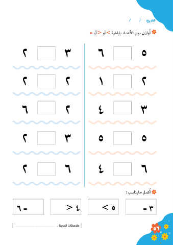 / / :خيراتلا = وأ < وأ > ةراشإب دادعلأا ينب نزاوأ ُ 2 3 6 5 2 2 1 2 6 2 4 3 2 3 5 5 2 6 4 6 : بسانيام لمكأ ُ 6 = ....................... ....................... < 4 .......................> 5 ....................... = 3 : ةيبرملا تاظحلام 56