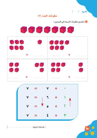 / / :خيراتلا )7( ددعلا تانوكم : ينمسق لىإ ةعبسلا تابعكم مسقنل + + + + 7 = 7 + 0 7 = 6 + 1 7 = 5 + ٢ 7 = 4 + 3 : ةيبرملا تاظحلام 70
