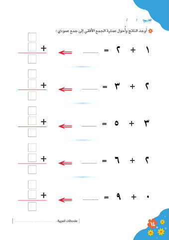 / / :خيراتلا ُ : يدومع عمج لىإ يقفلأا عمجلا ةيلمع لوحأو جتانلا دجوأ َ + ................... = 2 + 1 + ................... = 3 + 2 + ................... = 5 + 3 + ................... = 6 + 2 + ................... = 9 + 0 : ةيبرملا تاظحلام 14
