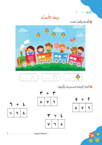 / / :خيراتلا َ داُدعلأا طبر َ : ددعلا بتكأو ظحلاأ ُ ُ ُ : اهنولأو ةحيحصلا ةباجلإا ُراتخأ َ 3 + 3 5 + 2 6 + 4 8 7 6 8 7 6 10 9 8 3 + 4 7 6 5 : ةيبرملا تاظحلام 18